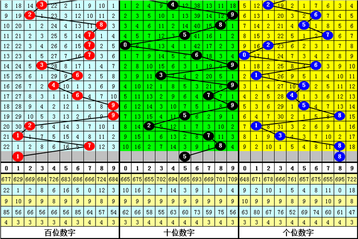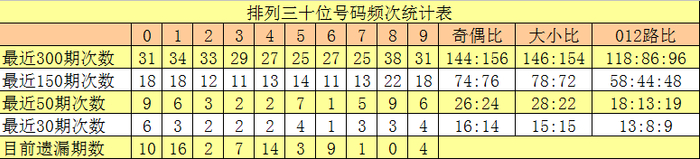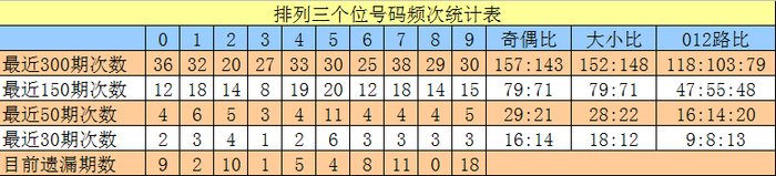 百位号码:前50期走势活跃的号码为:7开出8个,5开出7个,3、9开出6个;走势最冷的号码为:0、6开出3个,1、2、4开出4个。奖号012路比开出18:16:16,奇偶比开出31:19。本期百位杀排除:2、3,注意号码0、1、4,胆码参考1。
