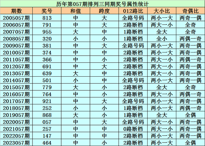 历史上第2024057期排列三已开出19期奖号了,历年同期奖号分别为:813、791、955、320、381、374、366、691、639、501、779、764、921、252、868、057、257、147、464,详细统计见下表: