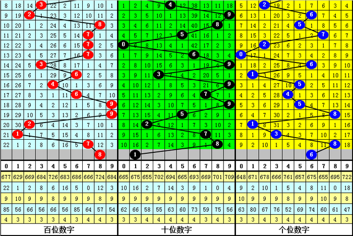 号码012路分析:在历年第057期开奖中,号码012路总比例为22:20:15,其中0路号码断档3期,1路号码断档6期,2路号码断档9期,本期012路比参考1:1:1。