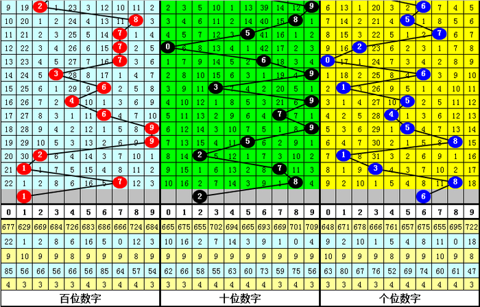 百位:近期大小号码开出比例基本相当,上期开出大号之后,本期注意该位小号出现;另外,该位0路和1路号码在最近18期奖号中走势较热,2路号码表现相对较冷,本期该位放弃2路号码,参考号码1。
