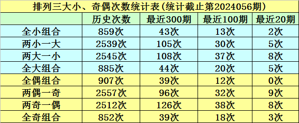 连续10期奖号中,两小一大形态开出2期,两大一小形态开出4期,全大形态开出3期,全小形态开出1期,本期大小形态判断:两大一小奖号。