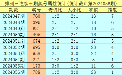 上期回顾:排列三第2024056期奖号:788。类型:组三,奇偶形态:奇偶偶,大小形态:大大大,和值:23,跨度:1。