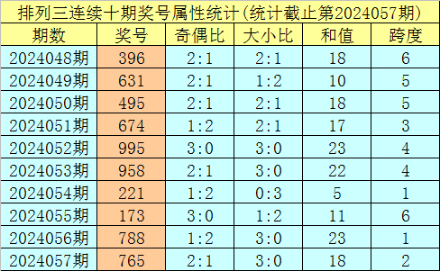 上期回顾:排列三第2024057期奖号:765。类型:组六,奇偶形态:奇偶奇,大小形态:大大大,和值:18,跨度:2。