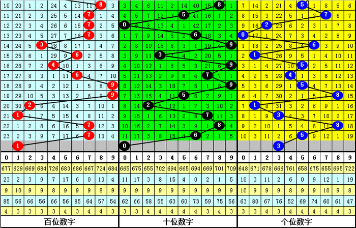 百位号码奇偶比为4:2,奇数号码表现相对较热,本期预计奇数号码再出;大小比为3:3,相等,本期预计小号出现。