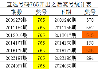 从上表统计可以看出,直选号码765开出之后,其下期奖号: