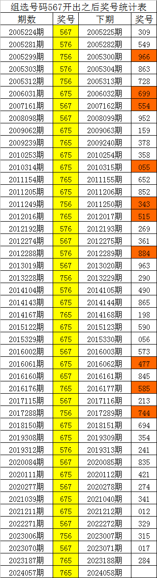 体彩排列三组选号码567历史上出现了45次,其下期奖号分别为:309、549、966、863、728、699、554、952、159、378、358、055、652、852、343、515、269、361、884、963、290、490、865、198、590、056、573、477、845、585、213、744、694、354、241、835、421、274、341、012、329、315、017、284,详细统计见下表: