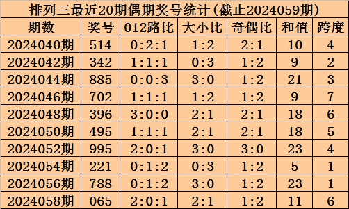 上期回顾:排列三2024059期奖号为629,奇偶比为1:2,大小比为2:1,跨度为17。