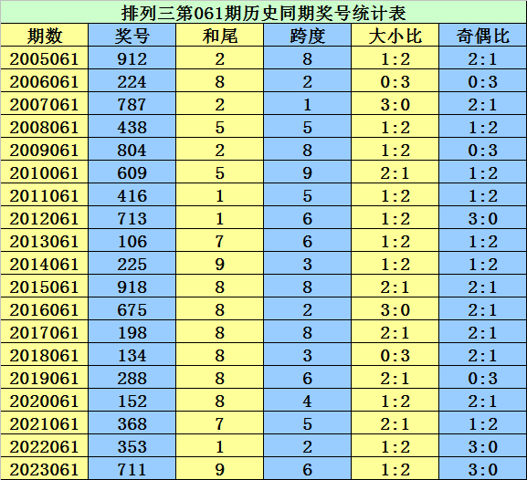 从2004年至今排列三已开出6832期奖号了,本期为排列三2024年第061期开奖,历史同期已出现19次奖号: