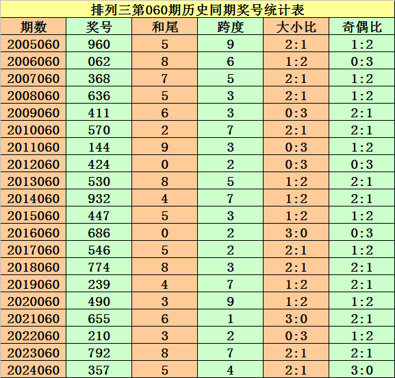 历年第060期排列三同期奖号开出:960、062、368、636、411、570、144、424、530、932、447、686、546、774、239、490、655、210、792、357。