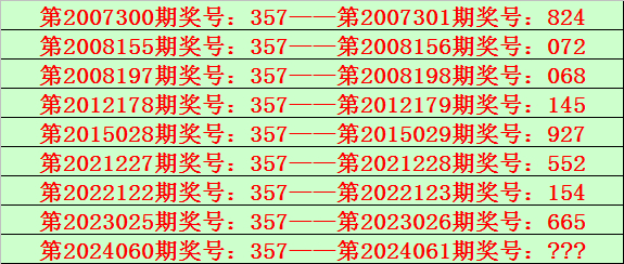 排列三第2024060期开出奖号357,该号码直选类型历史上出现了9次,前8次开出之后期下期奖号为:824、072、068、145、927、552、154、665,见下表: