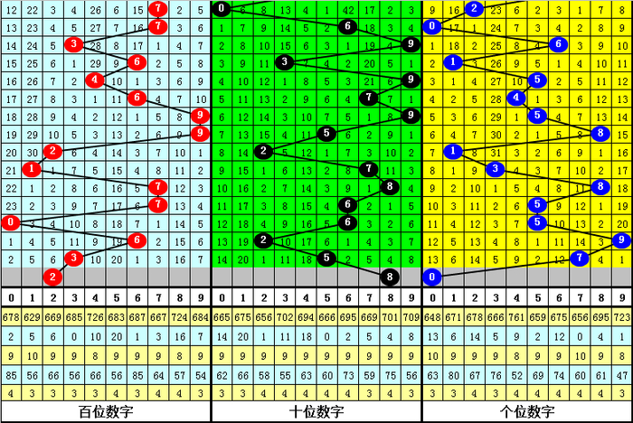 大中小分析:在组选0-9号码分布图中,前10期小号(0-2区段)出现6枚奖号,中号(3-6区段)出现12枚奖号,大号(7-9区段)出现12枚奖号,上期0小号区域断区,本期看好中号码走冷,注意3-6区段不落号。