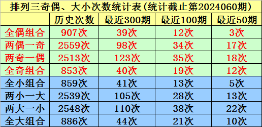大小、奇偶分析:在连续40期奖号中,全小出现4期,当前遗漏6期、两小一大出现9期,当前遗漏5期、两大一小出现20期,当前遗漏0期、全大出现7期,当前遗漏3期,本期看好开出全小;全偶有3次,目前遗漏29期、两偶一奇有17次,目前遗漏1期、两奇一偶有18次,目前遗漏3期、全奇有12次,目前遗漏0次,本期预计出现两偶一奇。