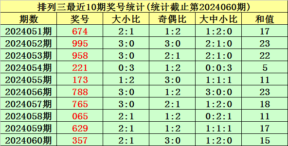 上期回顾:排列三第2024060期奖号为:357。奖号类型:组六,和值:15,奇偶比:3:0,跨度:4,大小比:2:1。