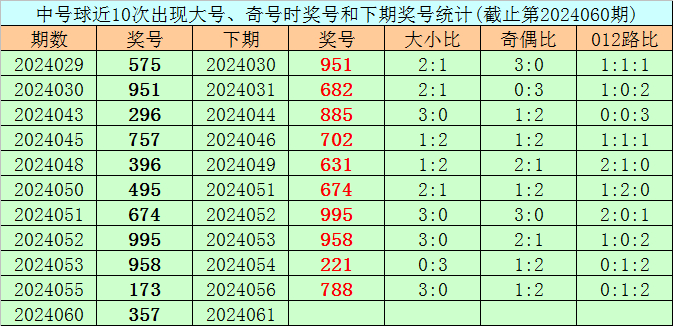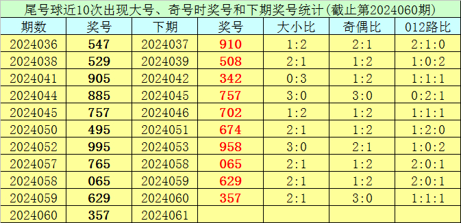 在尾号球前10次开出大号、奇号类型之后,其下期分别开出奖号:910、508、342、757、702、674、958、065、629、357,其中号码奇偶比为4:6,大小比为6:4,012路比为2:3:5。