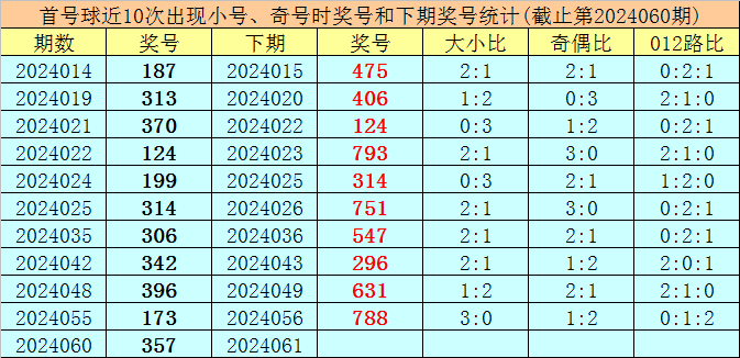 在首号球前10次开出小号、奇号类型之后,其下期分别开出奖号:475、406、124、793、314、751、547、296、631、788,其中号码大小比为5:5,012路比为2:6:2,奇偶比为6:4。