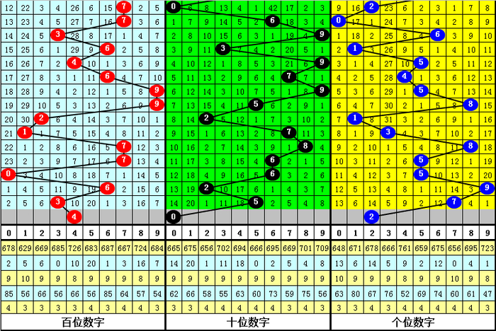 跨度分析:最近5期分别开出跨度:1、2、6、7、4,本期防跨度4重复开出。