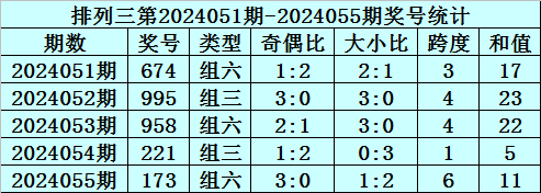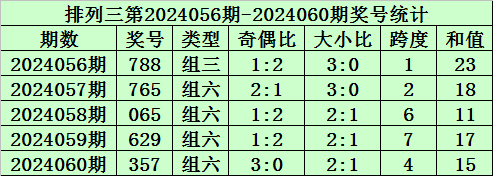 上期回顾:排列三第2024060期开奖号码为357。奖号类型为组六,奇偶比为3:0,大小比为2:1,跨度为4,和值为15。