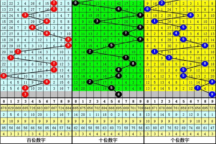 百位走势:近10期在0-9之间出号,跨度为10点,出号比较分散,上期奖号为3,下降3点,本期注意该位重复出现。另外近10期该位大小比为6:4,小号较冷,本期防小号回补,关注号码3。