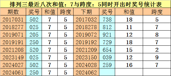 开奖回顾:体彩排列三第2024061期奖号为:250。和值为:7,跨度为:5。