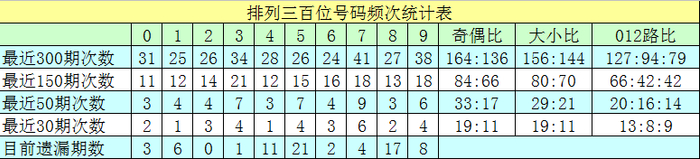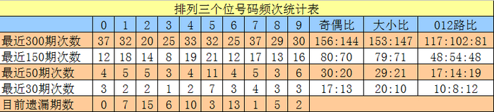 百位号码:前50期走势活跃的号码为:7开出9个,3、5开出7个;走势最冷的号码为:0、4、8开出3个。奖号012路比开出20:16:14,奇偶比开出33:17。本期百位杀排除:1、3,注意号码2、4、9,胆码参考4。