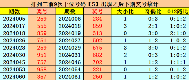 在十位前9次出现号码5后,其下期奖号分别开出:8-5-1-0-7-8-0-2-5,其中奖号个数大小比是5:4,012路比是2:2:5,奇偶比是4:5。