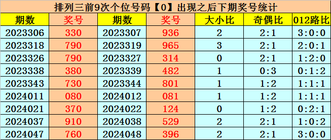 个位号码:上期奖号为小号、偶数、0路号码:0,历史上个位号码0共开出649期,前一次出现在第2024047期,上期遗漏13期再出。