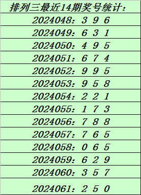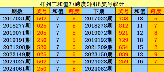 上期回顾:排列三第2024061期奖号:250。和值7,跨度5。