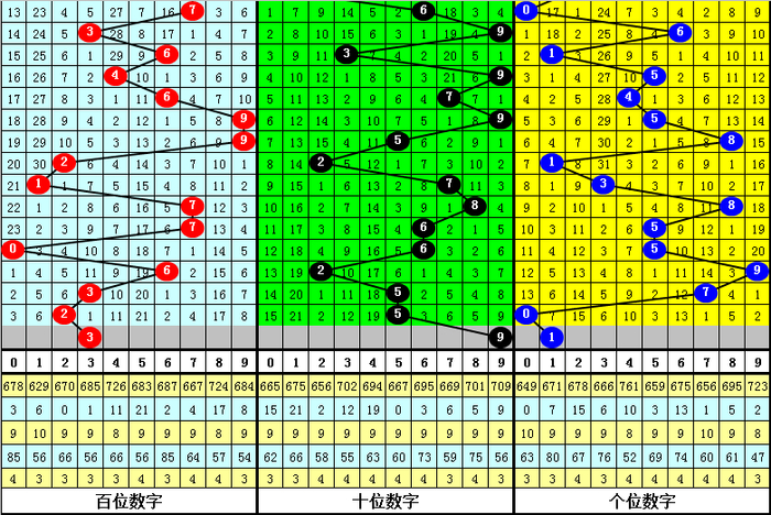 本期首位号码注意1路跨度,参考跨度0、1、7。