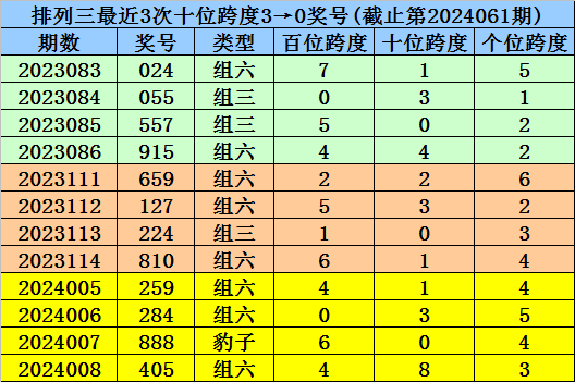 第2024005-第2024007期奖号:259、284、888,其下期奖号为:405,中位号码跨度为4;