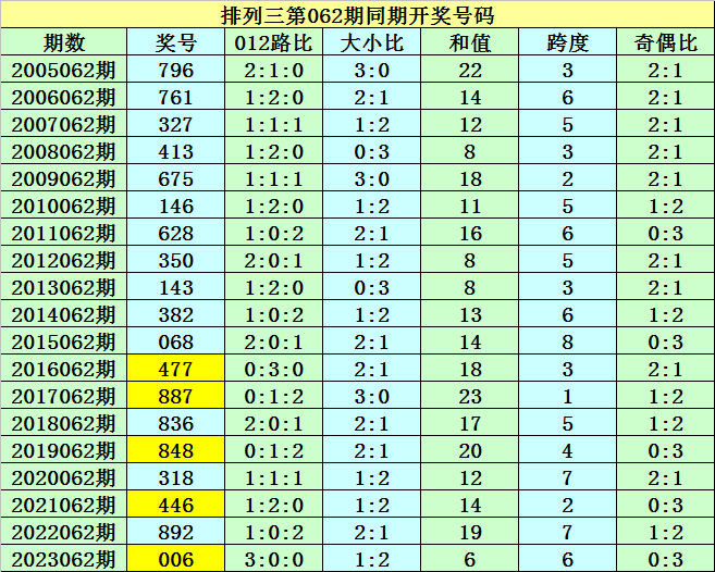 号码012路比:第062期历史同期号码012路比为22:19:16,本期预计012路比开出0:1:2。