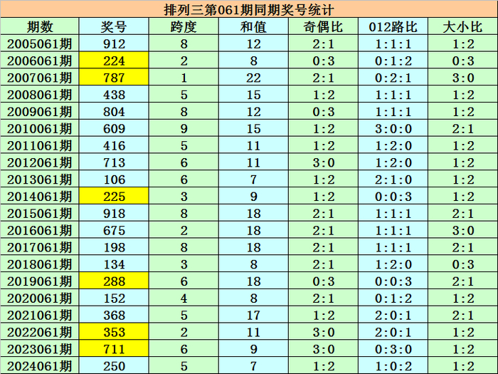 上期回顾:排列三第2024061期奖号为250,组选类型为组六,奖号大小比为1:2,012路比为1:0:2,奇偶比为1:2。