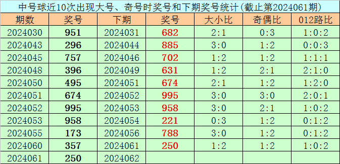 在中号球前10次开出大号、奇号类型之后,其下期分别开出奖号:682、885、702、631、674、995、958、221、788、250,其中号码大小比为7:3,012路比为3:1:6,奇偶比为5:5。