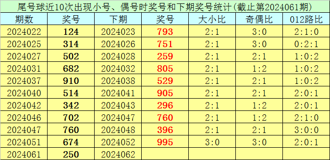 尾号球:上期奖号为0,开出小号、偶号,该位前10次开出小号、偶号的现象时其奖号分别为:124、314、502、682、910、514、342、702、760、674,其中尾号球012路比为2:4:4。