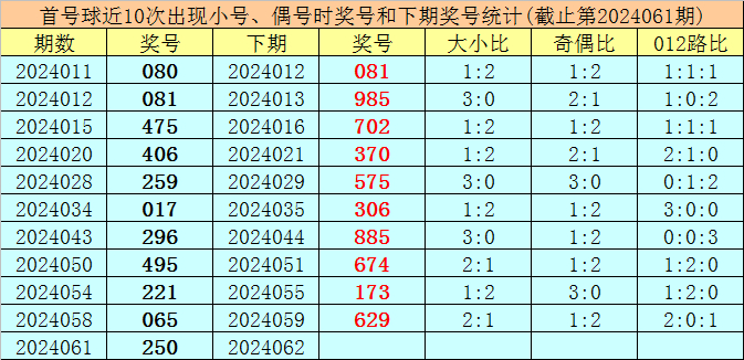 在首号球前10次开出小号、偶号类型之后,其下期分别开出奖号:081、985、702、370、575、306、885、674、173、629,其中号码奇偶比为6:4,大小比为6:4,012路比为6:2:2。