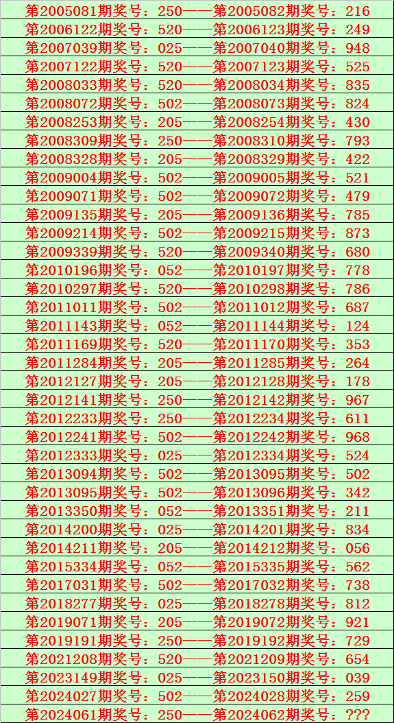开奖回顾:体彩排列三第2024061期奖号为:250,类型:组六。