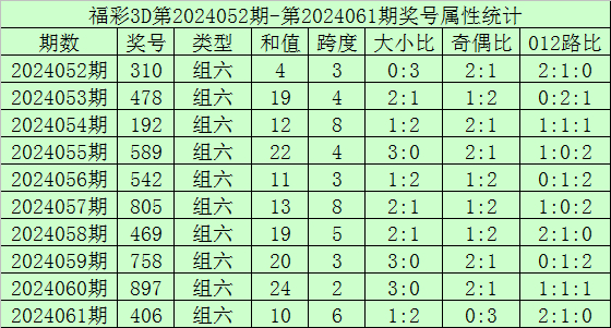开奖回顾:福彩3D第2024061期开奖号:406,其中奖号和值:10,奇偶比0:3,大小比1:2。