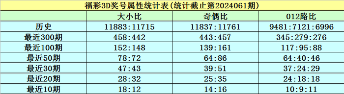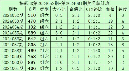 开奖回顾:福彩3D第2024061期奖号为406,其中奖号大小比为1:2,奇偶比为0:3,012路比为2:1:0,和值为10,跨度为6。