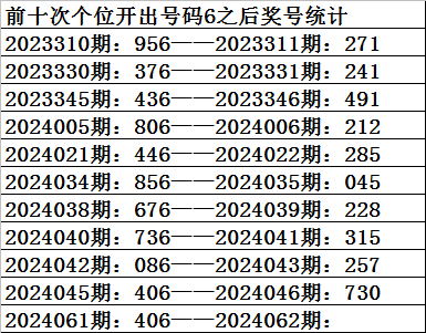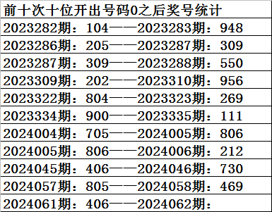 一、上期开奖:福利彩票3D第2024061期奖号为406。奇偶比为0:3,大小比为:1:2,奖号和值为10,奖号跨度为6。