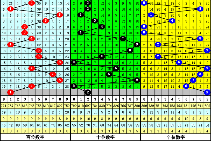 百位分析:百位上期开出号码4,历史上该位号码4出现了768次,最近100期号码4出现次,上期间隔2期再次出现。