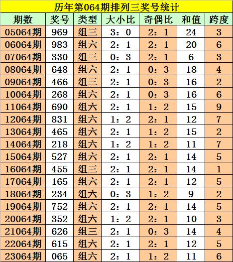 历年第064期排列三奖号:969 - 983 - 330 - 648 - 466 - 268 - 690 - 831 - 465 - 218 - 527 - 455 - 165 - 234 - 752 - 352 - 626 - 615 - 065。