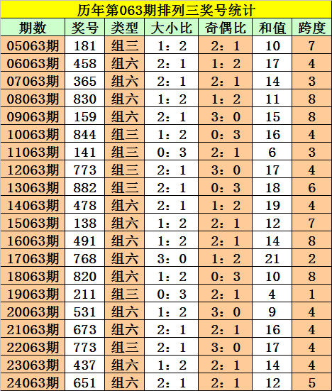 排列三第2024063期奖号:651,和值12,跨度5,大小比2:1,奇偶比2:1。