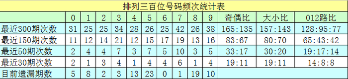 十位号码:前50期走势最活跃的号码为:5开出10个,0开出8个,9开出6个;走势最冷的号码为:3、4开出2个,6开出3个。十位号码012路比开出19:12:19,大小比开出29:21。本期十位排除两码:1、5,参考号码3、4、6,胆码关注6。