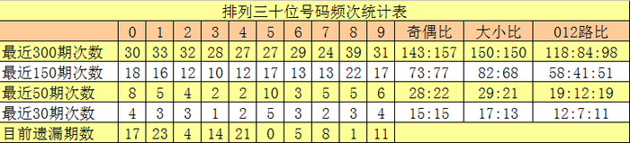 个位号码:前50期走势最活跃的号码为:5开出10个,9开出6个,1、2、4、7开出5个;走势最冷的号码为:3、8开出3个,0、6开出4个。个位号码大小比开出28:22,奇偶比开出29:21。本期个位排除两码:2、5,关注号码1、4、8,胆码参考8。