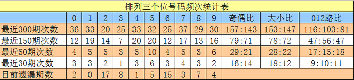 上期回顾:排列三第2024063期开出奖号651,号码012路比为1:1:1,奇偶比为2:1,大小比为2:1,和值为12,跨度为5。