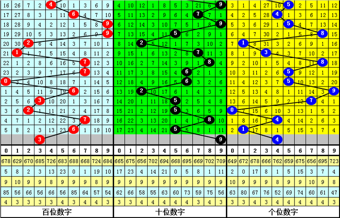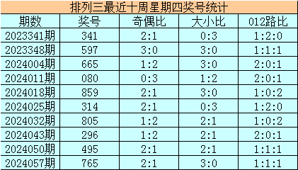排列三十周星期四分别开出奖号:765、495、296、805、314、859、080、665、597、341,其中号码奇偶比为16:14,奇偶号码出现比例相当;号码大小比为19:11,大号强势走热;号码012路比为13:7:10,0路号码热出。