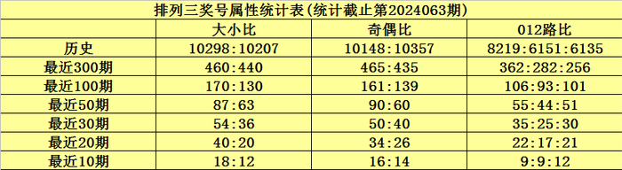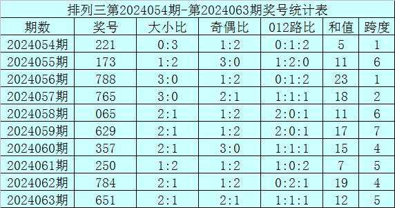 上期回顾:排列三第2024063期奖号为651,奖号012路比为1:1:1,奇偶比为2:1,大小比为2:1,和值为12,跨度为5。