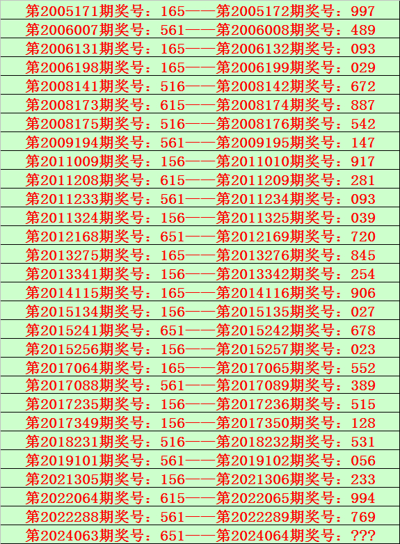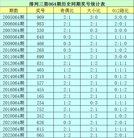 排列三第2024064期开奖日期:2024年3月14日,历史上第064期已开出了19次奖号,历年同期号码分别为:969、983、330、648、466、268、690、831、465、218、527、455、165、234、752、352、626、615、065。
