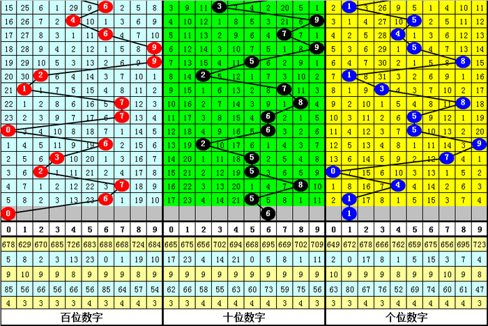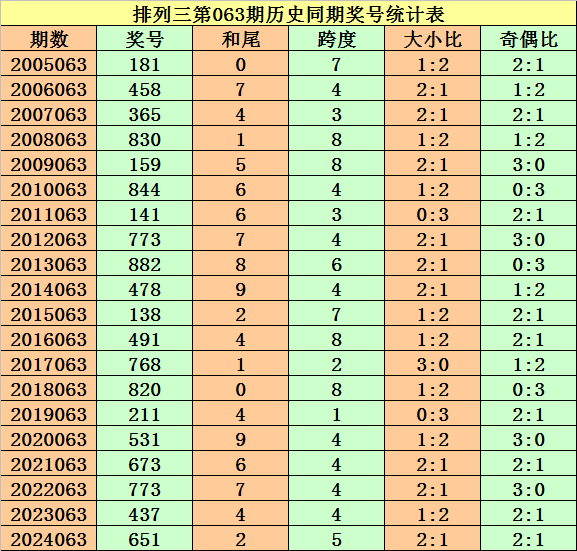 跨度分析:在排列三第064期历史同期中,奖号跨度012路比为7:5:7,奇偶比为11:8,大小比为10:9,跨度出现期数为:跨度5→4期,跨度2、3、6→3期,跨度4、7→2期,跨度1、9→1期,跨度0、8→0期,本期预计开出0路跨度,精选跨度6。