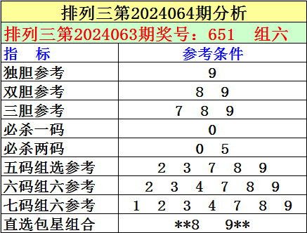 1.排列三最近十期分别开出号码:221-173-788-765-065-629-357-250-784-651,其中有6期奖号开出了上期的重复号码,本期防重号轮空,排除第2024063期奖号:651中的号码,关注号码:7。