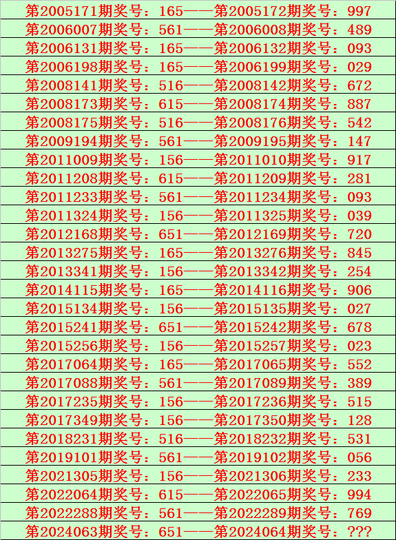 排列三第2024063期开出奖号651,该号码历史上组选出现29次,前28次开出之后期下期奖号为:997、489、093、029、672、887、542、147、917、281、093、039、720、845、254、906、027、678、023、552、389、515、128、531、056、233、994、769,详见下表: